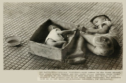 Chỉ với một chiếc bát nhựa, hai anh em cậu bé ăn mày bé nhỏ này phải tự mình kiếm sống để tồn tại (Sài Gòn, 1965-1975). (Ảnh AP) |