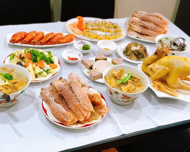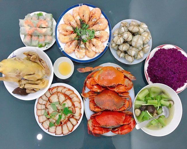 | Mâm cỗ đầy màu sắc, đủ từ gà, thịt và hải sản... |