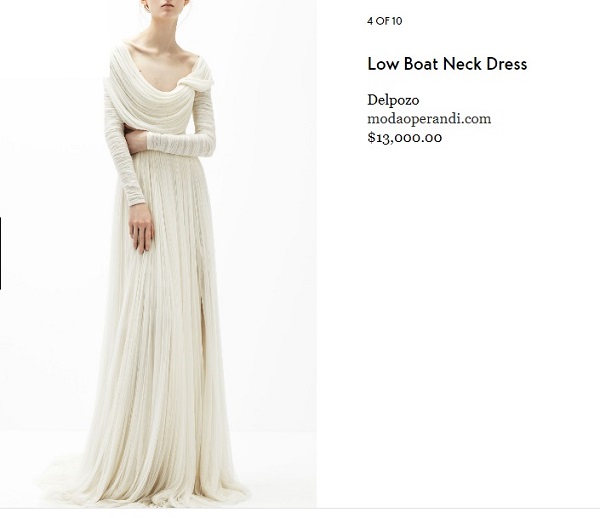 Delpozo là một nhà thiết kế thường lấy cảm hứng từ trang phục Hy Lạp thời cổ đại và đây là một trong những mẫu váy cưới trễ cổ nổi bật có giá 13.000 USD - Ảnh: Elle |