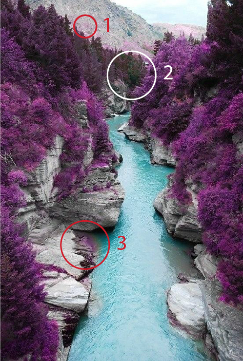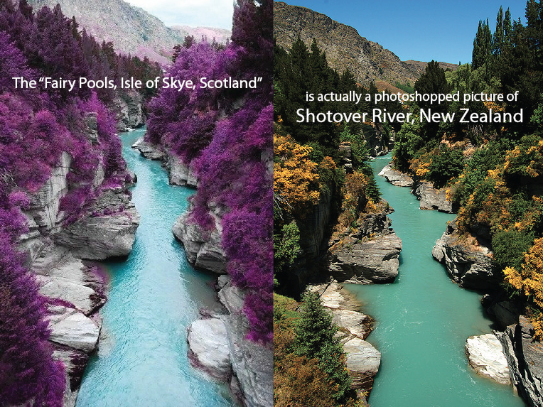Sự thật: Nếu những cây này có thật trên thế giới chắc chắn sẽ rất đẹp. Nhưng tiếc thay nó chỉ là sản phẩm của Photoshop. Những cây này không hề có màu tím, cũng không phải ở Scotland. Hình ảnh thật thuộc sông Shotover ở New Zealand.