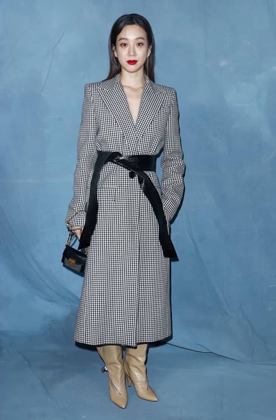 Diễn viên Jung Ryeo Won ngọt ngào và đơn giản với váy dài hoạ tiết houndstooth, điểm nhấn thắt lưng đen phá cách, mini bag cùng boots mũi nhọn tại Givenchy show, Paris.