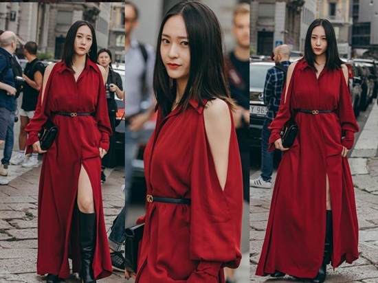 Giống như chị gái của mình Krystal cũng nổi bật giữa đám đông khi diện váy đỏ cut-out của thương hiệu Ferragamo và boots đen cao cổ. Krytal được ca ngợi là hoàn hảo ở mọi góc máy dù chọn kiểu tóc và make-up cực kỳ đơn giản.