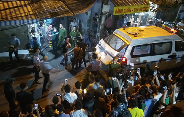 Lực lượng chức năng đưa 2 thi thể được phát hiện trong hiện trường vụ cháy lên xe cứu thương đêm 21/9. Ảnh: Xuân Đoàn. |
