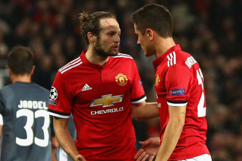 Blind (trái) khẳng định sẽ ở lại M.U, còn Herrera băn khoăn về việc đi hay ở. Ảnh: báo Dân Việt. |