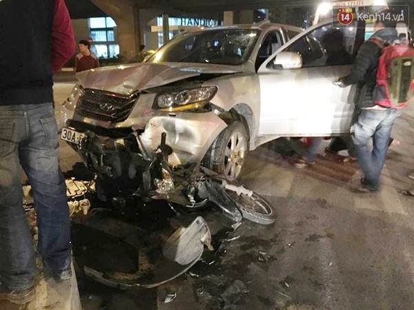 Chưa dừng lại, xe Santafe tiếp tục lao đến đâm vào xe máy do một nam thanh niên chở theo cô gái trẻ phía sau.