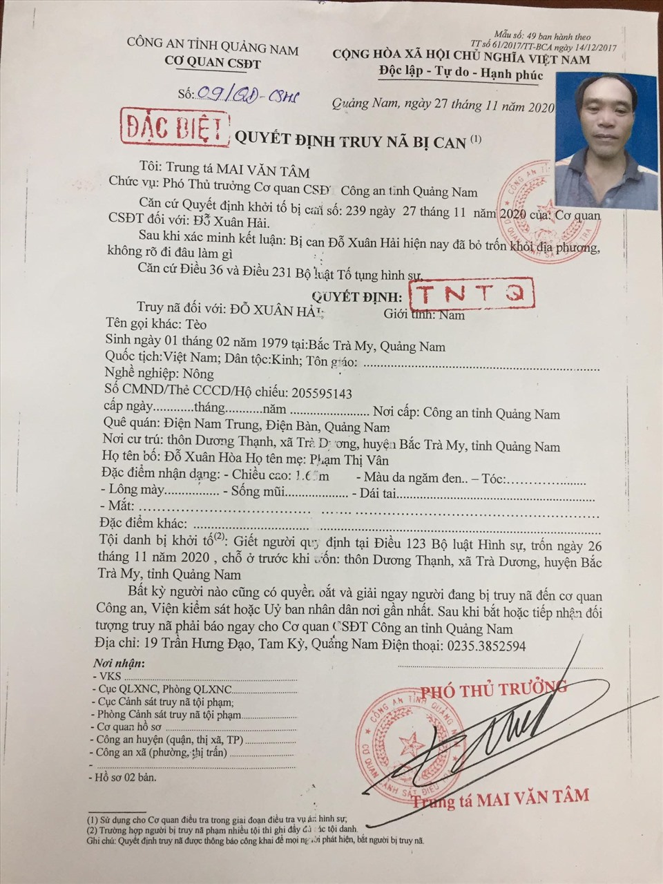 Quyết định truy nã bị can Đỗ Xuân Hải. Ảnh: Công an Quảng Nam |