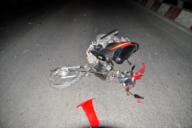 Va chạm mạnh khiến cho chiếc xe máy bật tung, văng ra xa khoảng 3m. Toàn bộ phần đầu xe vỡ vụn. Trong khi đó, taxi ngược chiều cũng bị hỏng hóc nghiêm trọng phần đầu phía bên trái.