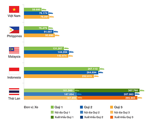 Kết quả thống kê lượng tiêu thụ ô tô tại các nước trong khu vực Asean cho thấy, kết thúc quý III/2016, sự tăng trưởng của thị trường ô tô khu vực Đông Nam Á có xu hướng giảm sụt mạnh, những thị trường lớn như Thái Lan, Indonesia, Malaysia đều phủ một màu xám đặc. Hiệp hội ô tô Malaysia (MAA) cho biết, trong 9 tháng đầu năm nay, lượng tiêu thụ ô tô của toàn thị trường chỉ đạt 418.445 xe, giảm tới 13,8% so với cùng kỳ năm trước. Trong 9 tháng đầu năm 2016, lượng ô tô tiêu thụ tại thị trường nội địa Thái Lan đạt 556.509 xe, tăng 0,5% so với cùng kỳ năm ngoái. Trong khi đó, lượng xe xuất khẩu chỉ đạt 890.726 xe, giảm 0,5%. Tại Indonesia, mặc dù tình hình có khả quan hơn nhưng tốc độ tăng trưởng cũng rất chậm. Kết thúc quý III/2016, lượng xe tiêu thụ của toàn thị trường Indonesia chỉ đạt 783.822 xe, tăng 2,5% so với cùng kỳ năm 2015.