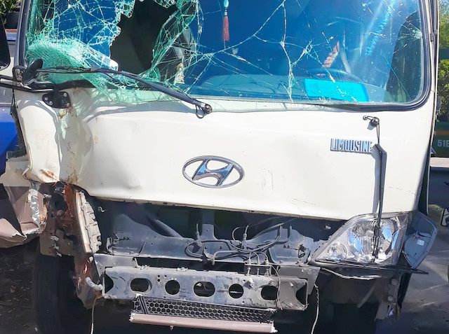 Cú tông mạnh khiến phần đầu ôtô khách biến dạng, kính chắn bị vỡ. Còn phần hông ôtô 7 chỗ hư hỏng nặng. Hàng chục người trên ôtô khách một phen hốt hoảng. Rất may, cú va chạm giữa hai ôtô không gây thương vong về người.