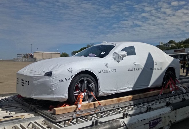 Một trong số 40 chiếc siêu xe Maserati được Papua New Guinea đặt mua phục vụ hội nghị thượng đỉnh APEC. Ảnh: Air Bridge Cargo Airlines. |