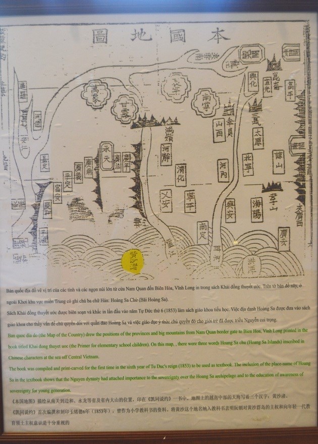 | Trên bản quốc địa đồ này, ở ngoài khơi khu vực miền Trung có ghi chú 3 chữ Hán là “Hoàng Sa chữ” (Bãi Hoàng Sa) và vào năm 1853, nhà Nguyễn đã cho in bản đồ này trong sách giáo khoa tiểu học. |