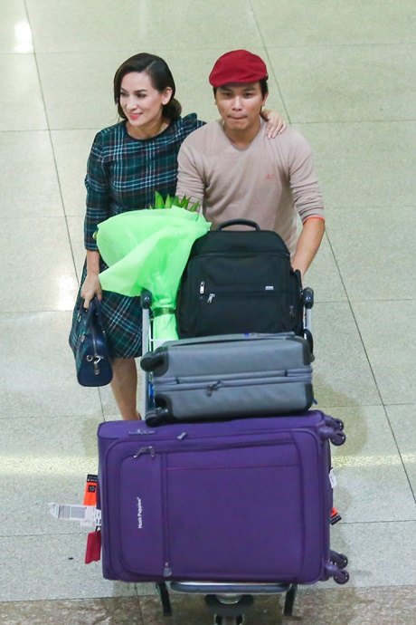 Xuất hiện tại sân bay Tân Sơn Nhất, Mạnh Quỳnh diện trang phục đơn giản với áo thun, quần vải cùng chiếc mũ phớt quen thuộc. Vừa nhìn thấy người bạn thân, Mạnh Quỳnh và Phi Nhung đã ôm chầm lấy nhau và tranh thủ selfile, trò chuyện rôm rả trong lúc đợi Mạnh Quỳnh lấy hành lý. Rất nhiều người có mặt tại sân bay cũng nhận ra sự có mặt của cặp đôi "song ca vàng" và xin chụp hình chung.
