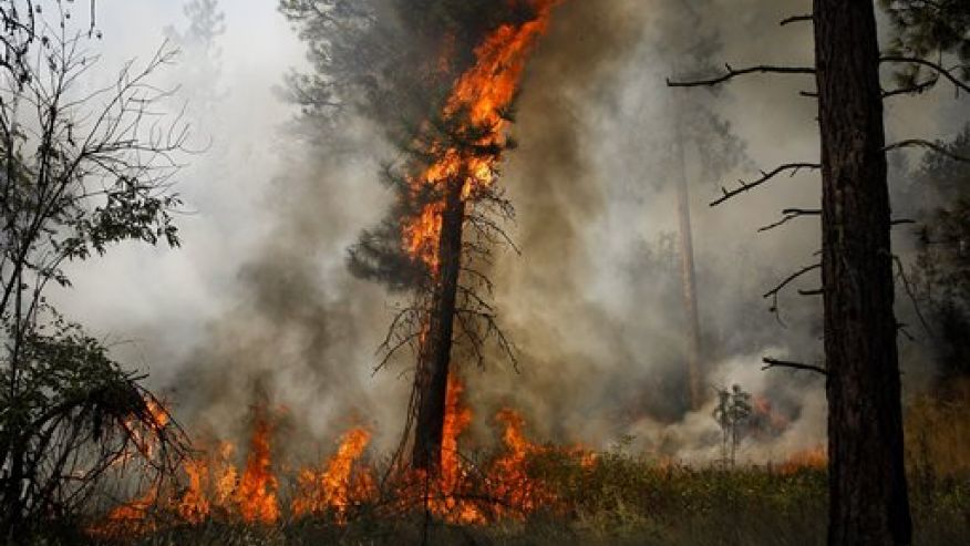 Cây bị bao trùm bởi đám cháy tại hạt Okanogan, Washington. |