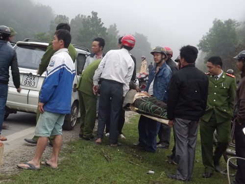 | Lực lượng chức năng đang đưa người bị thương qua cửa sổ xe để cấp cứu |