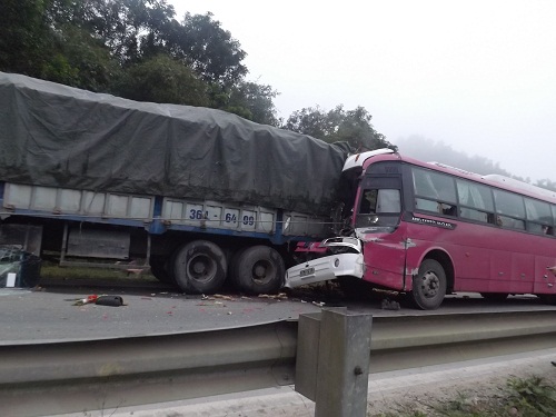 | Chiếc xe khách đâm mạnh vào đuôi xe tải |