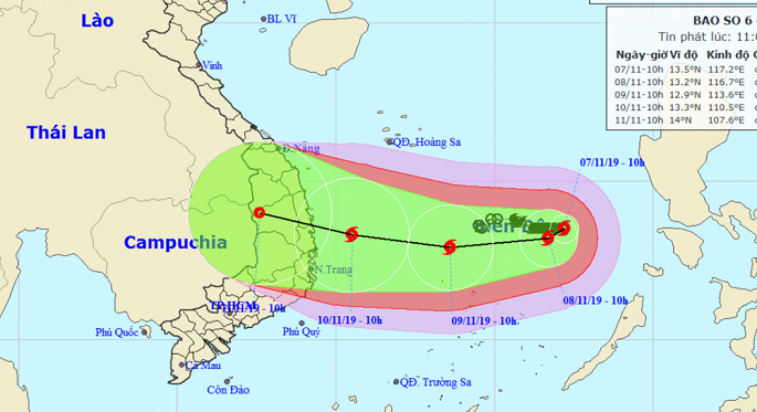Liên quan đến tình hình bão trên biển Đông, báo VOV dẫn thông tin từ Trung tâm Dự báo KTTV Quốc gia, vào hồi 4h ngày 7/11, vị trí tâm bão ở vào khoảng 13,5 độ Vĩ Bắc; 116,8 độ Kinh Đông, cách đảo Song Tử Tây (quần đảo Trường Sa) khoảng 340km về phía Đông Bắc. Sức gió mạnh nhất vùng gần tâm bão mạnh cấp 9 (75-90km/giờ), giật cấp 11. Bán kính gió mạnh từ cấp 6, giật từ cấp 8 trở lên khoảng 110km tính từ tâm bão.