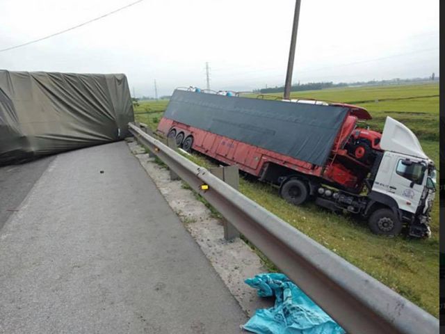 Vào thời điểm trên, xe tải mang biển số TP.HCM chạy theo hướng Nam- Bắc đã va chạm với một chiếc xe tải mang BKS Hà Nội chạy theo hướng ngược lại. Cú va chạm khiến một chiếc xe tải đâm qua taluy, lao xuống vệ đường, chiếc xe còn lại thì lật chấn ngang đường.