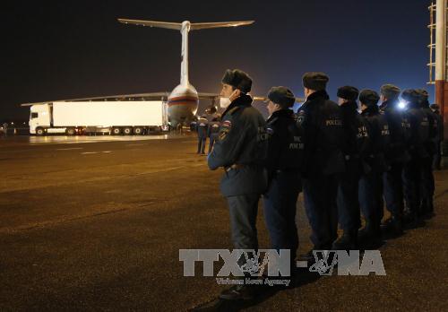 Nhân viên Bộ Tình trạng khẩn cấp Nga chuẩn bị chuyển thi thể các nạn nhân máy bay rơi từ máy bay chuyên chở tại sân bay St. Petersburg ngày 2/11. Ảnh: AFP/TTXVN |
