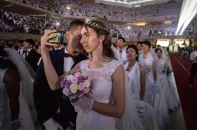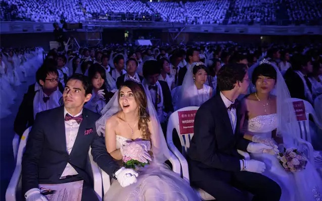 Hôm qua (28/8), đám cưới tập thể của 4.000 đôi nam nữ đã diễn ra tại quận Gapyeong, tỉnh Gyeonggi, Hàn Quốc. Các đôi cô dâu, chú rể từ nhiều quốc gia cùng trao nhẫn và nói lời thề ước với nhau. Nhiều đôi trong số này mới quen nhau không lâu.