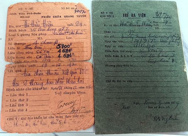 Vì thế trường hợp của ông Hà Hữu Hiệu, 77 tuổi, ở Yên Lãng, Hải Phòng khá đặc biệt. Có mặt tại Bệnh viện K cơ sở Tân Triều (Hà Nội) những ngày cuối tháng 10, cụ ông khiến nhiều y bác sĩ bất ngờ khi cầm trên tay “Thẻ ra viện”, “Phiếu chữa quang tuyến”, bệnh án của Bệnh viện K từ năm 1970. Những tờ giấy màu nâu, xanh cũ kỹ, một vài chỗ đã mờ mực không còn nhìn rõ được ông Hiệu bảo quản cẩn thận.