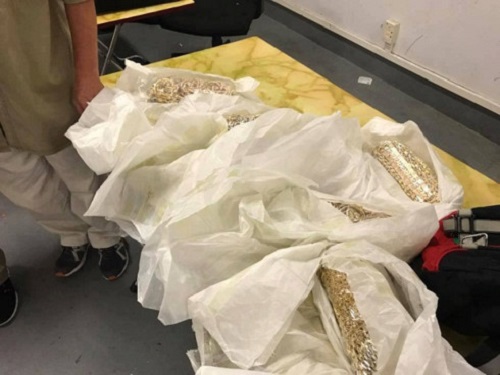 Lực lượng chức năng phát hiện nhóm này mỗi người quấn quanh bụng 3 bọc chứa kim loại vàng và trắng nhưng không khai báo. Tổng trọng lượng số kim loại nghi vàng gần 30 kg.