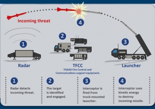 Hệ thống phòng thủ tầm cao giai đoạn cuối (THAAD) của Mỹ được thiết kế để bắn hạ tên lửa đạn đạo tầm ngắn và tầm trung. Dù THAAD không mang theo đầu đạn chứa thuốc nổ nhưng nó dựa vào động năng từ vụ va chạm tốc độ cao để diệt mục tiêu.