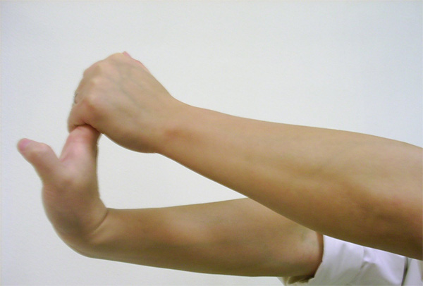 Mở rộng một cánh tay với lòng bàn tay úp. Đặt ngón tay của bàn tay còn lại lên những ngón đang bị kéo căng, nhẹ nhàng đẩy lên và kéo lại, gập cổ tay. Giữ như thế trong vài giây. Thả ra và lặp lại 10 lần.