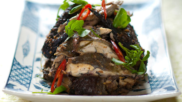 | VThịt lợn cắp nách Sapa cũng là món ngon không nên bỏ qua. Những miếng thịt non mềm, thơm và ngọt, không ngấy; phần bì vàng óng, giòn tan được tâm ướp gia vị kỹ càng, đậm đà và nhấm nháp cùng với chút rượu sẽ làm bạn “phải lòng” món ăn này ngay từ miếng đầu tiên. |