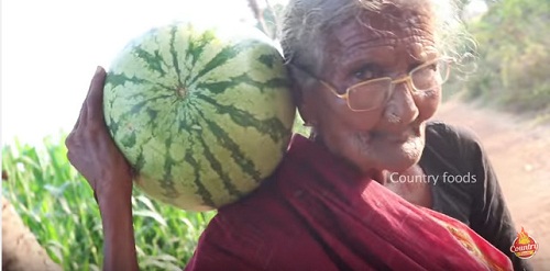 | Quả dưa hấu được bà Mastanamma bổ đôi, lấy hết phần thịt bên trong |