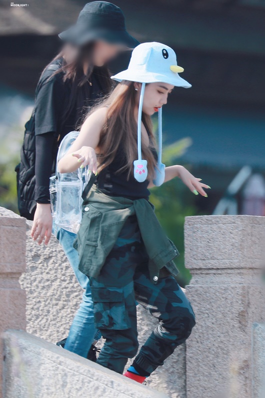 Cô nàng "bé hạt tiêu" An Kỳ diện trang phục ngầu nhưng lại đội mũ vịt đáng yêu lạc lối. |