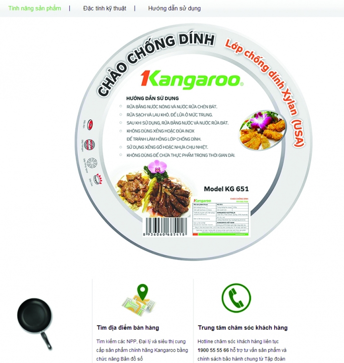 Chảo chống dính model KG 651 được Kangaroo nhập khẩu từ Trung Quốc song mã vạch lại có xuất xứ tại Việt Nam (chụp màn hình trang web của Kangaroo). |