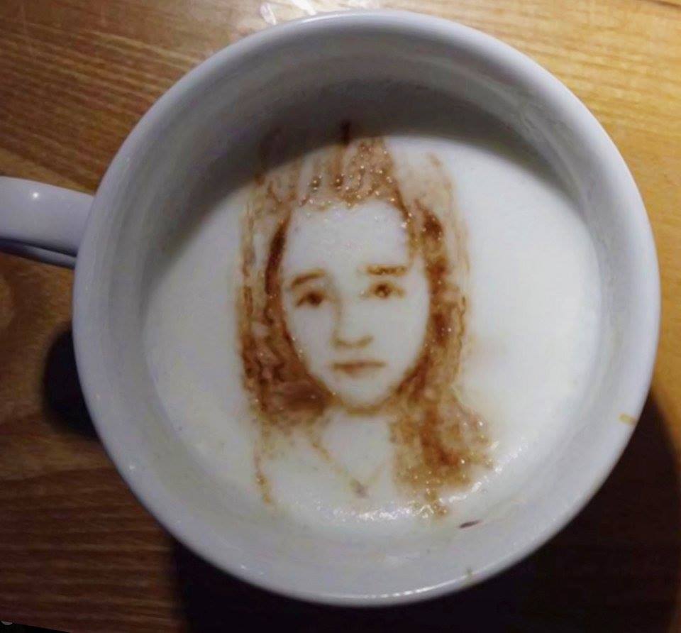 ![]() Tác phẩm tranh chân dung trên ly cà phê sữa. |