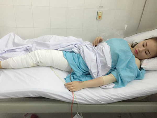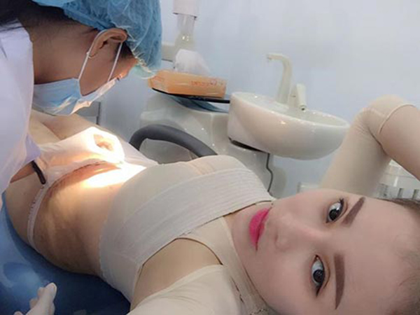 Hình ảnh của Anh Loan 10 ngày sau phẫu thuật tách mỡ bụng, đang được các bác sĩ tháo chỉ. |