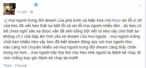 “Mọi người trong đội Dream của Phú Bình và Hiệp Hòa cho em xin lỗi vì status của em đã viết. Em thật sự biết lỗi và xin lỗi mọi người nhiều lắm do em còn trẻ, chưa nghĩ sâu xa được vấn đề nên bồng bột viết ra như vậy chứ thật sự không cố ý chà đạp lên tình yêu xe dream của mọi người....mọi người mắng chửi em nhiều như vậy em đã biết Dream đáng quý với mọi người như nào, càng nói chuyện nhiều với mọi người trong đội Dream càng thấy trân trọng nó hơn mọi người hãy tha thứ cho em nhé. Người ta đánh kẻ chạy đi chứ chẳng bao giờ đánh kẻ chạy lại mà”.