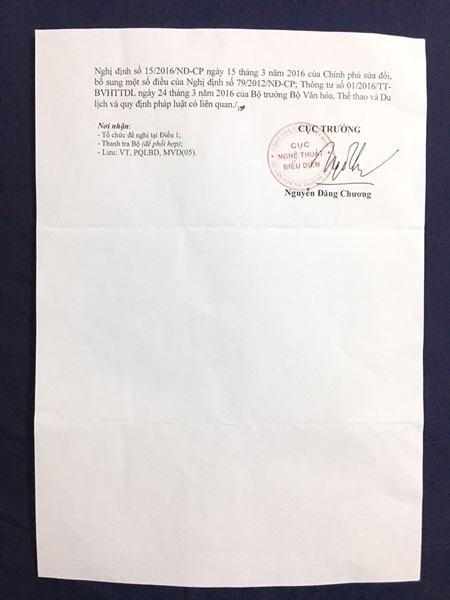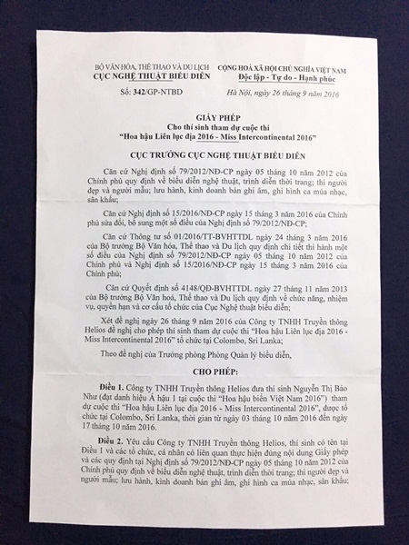 (ĐSPL) - Vừa qua, Cục Nghệ thuật biểu diễn vừa chính thức cấp giấy phép số 342/GP-NTBD ngày 12/9/2016 cho phép thi sinh Nguyễn Thị Bảo Như – Á hậu 1 cuộc thi Hoa hậu Biển Việt Nam 2016 tham dự cuộc thi “Hoa hậu Liên lục địa 2016 - Miss Intercontinental 2016” tại Sri Lanka từ ngày 03/10 đến ngày 17/10/2016.