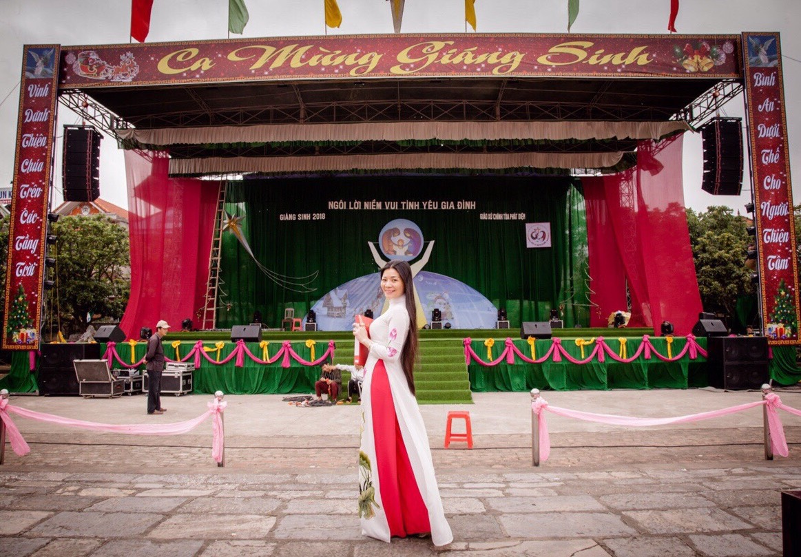 | Á Hậu Mai Vũ trong tà áo dài truyền thống đón Giáng sinh. |