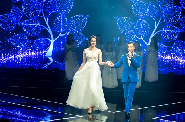 Trên sân khấu, Hoàng Anh đảm nhận vai trò vedette cho hai màn trình diễn thời trang. Trong bộ sưu tập dạ hội của NTK Cao Minh Tiến, cô mặc váy trắng, được ca sĩ Đức Tuấn cầm tay dìu đi một cách tình tứ. |