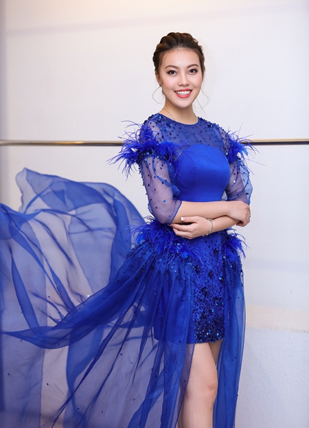 | Á hậu bản sắc dân tộc Thuý Hằng vốn sở hữu làn da trắng nên lựa chọn đầm xanh cobalt đính đá nổi bật. |