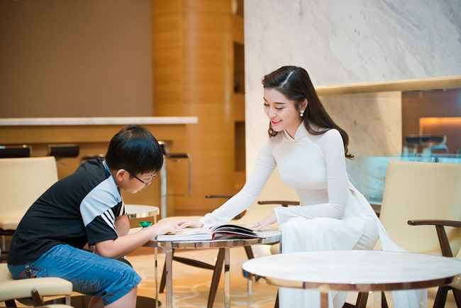 | Tới tham dự sự kiện, Huyền My lựa chọn bộ áo dài trắng muốt đơn giản nhưng thanh lịch. |