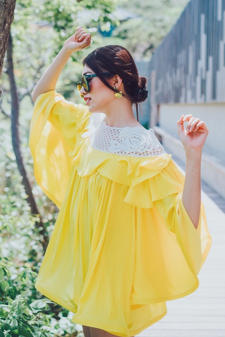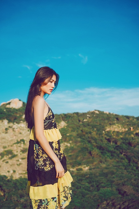 Á hậu Hoàn vũ Việt Nam 2015 khéo léo chuyển động cơ thể một cách tự nhiên như hình ảnh một cô nàng đang dạo chơi giữa mùa hạ xanh mát nhưng vẫn đậm tính thời trang, vừa đủ để những khung ảnh mang sự chuyên nghiệp.