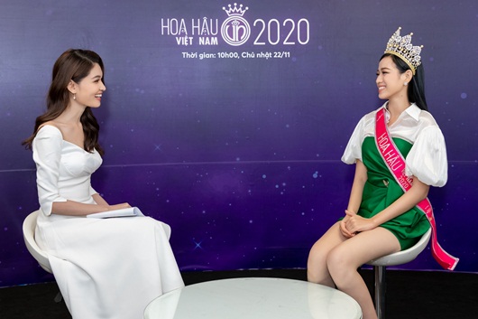 Á hậu Thuỳ Dung đảm nhận vai trò MC của một buổi giao lưu trực tuyến với top Hoa hậu Việt Nam 2020 Đỗ Thị Hà, Phạm Ngọc Phương Anh và Nguyễn Lê Ngọc Thảo. |