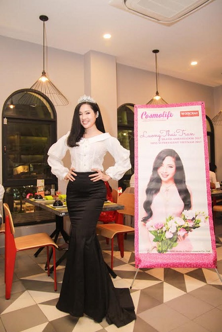 Tại sự kiện, tân Á hậu Siêu tài năng Thế giới 2017 Lương Thái Trân trang điểm thanh thoát, đầu đội vương miện lấp lánh, toát lên vẻ cao sang của một bậc vương hậu thế giới. Nàng Á hậu đã thay ba bộ đầm của nhà thiết kế Đặng Tuấn Vũ Project Runway, Tony Hoàng trong suốt buổi tiệc của mình. Phảng phất trong nhan sắc xứng tầm vóc quốc tế ấy là nét đẹp thành thị quyến rũ, sắc sảo và cũng không kém phần ngọt ngào, cuốn hút. Suối tóc đen huyền mượt mà, óng ả, đậm chất phương Đông càng tôn lên nét đẹp của một bậc vương hậu châu Á.