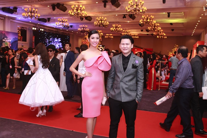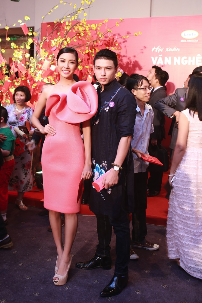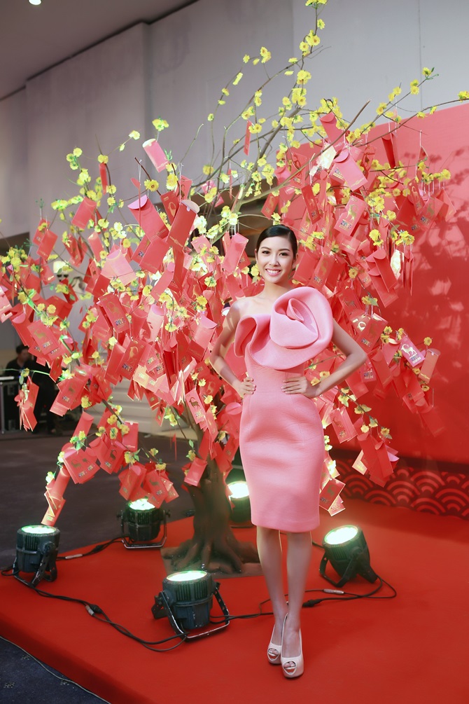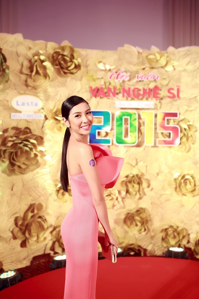 (ĐSPL) - Trong chiếc váy hồng có kiểu dáng ôm sát cơ thể với điểm nhấn bông hoa ở phía trước, đại diện Việt Nam tham gia tranh tài ở Hoa hậu Quốc tế 2015 khoe đôi vai trần gợi cảm cùng nụ cười tươi tắn của bản thân ở sự kiện Hội xuân văn nghệ sĩ tối 10/02 tại TPHCM.
