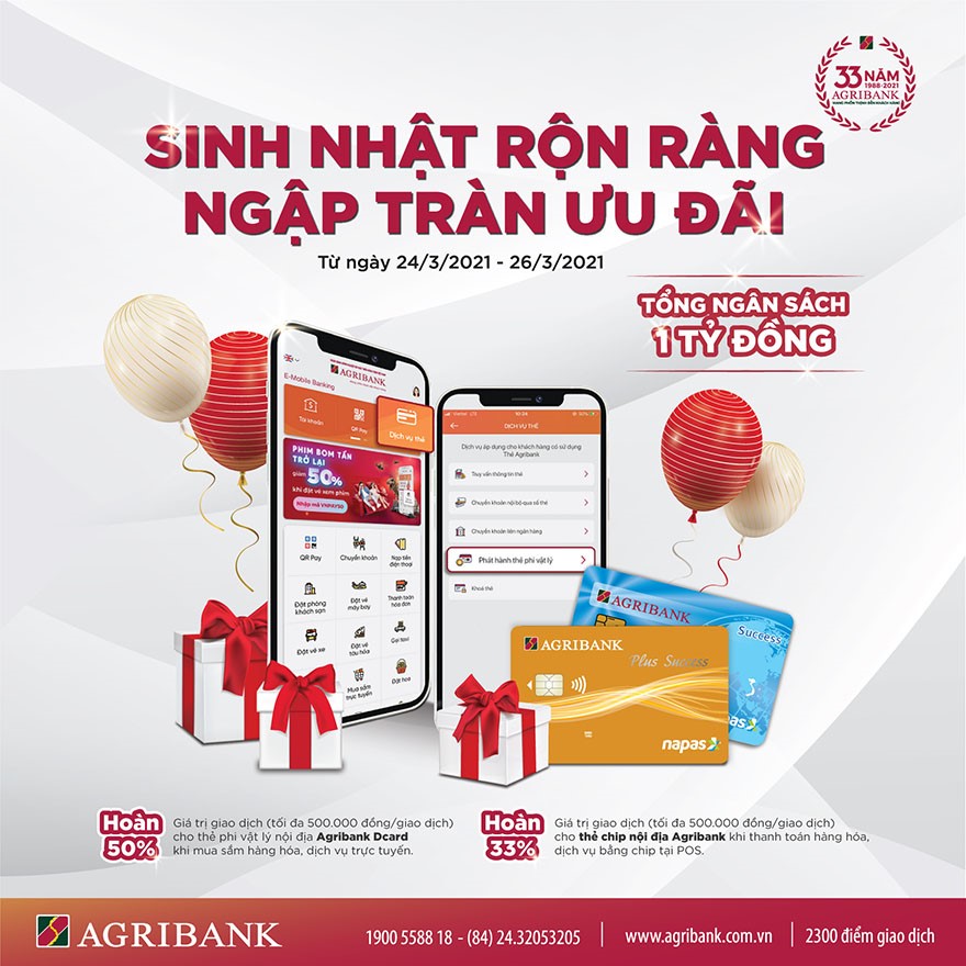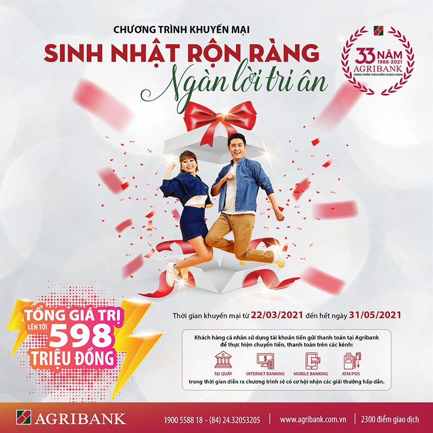 Để đánh dấu chặng đường 33 năm xây dựng và phát triển của Agribank (26/3/1988 - 26/3/2021) và tri ân khách hàng đã cùng đồng hành cùng Agribank trong thời gian qua, Agribank triển khai nhiều chương trình khuyến mãi với vô vàn các giải thưởng hấp dẫn với tổng trị giá hơn 02 tỷ đồng.