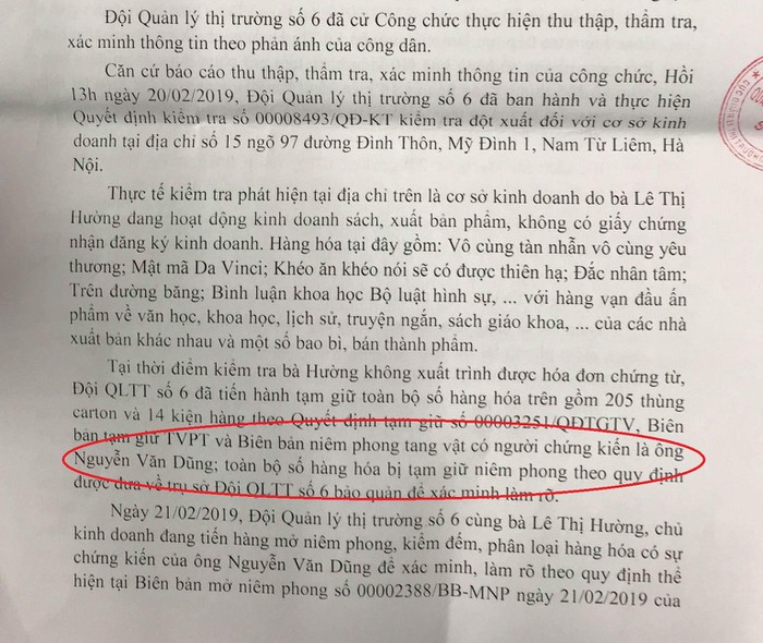 Trong văn bản số 37/QLTT – Đ6 của Đội QLTT số 6 đã khẳng định người chứng kiến để xác minh cho quá trình làm việc của Đội QLTT số 6 là ông Nguyễn Văn Dũng những đã không ghi rõ ông Nguyễn Văn Dũng chính là chồng bà Lê Thị Hường, hộ gia đình đang có dấu hiệu vi phạm.