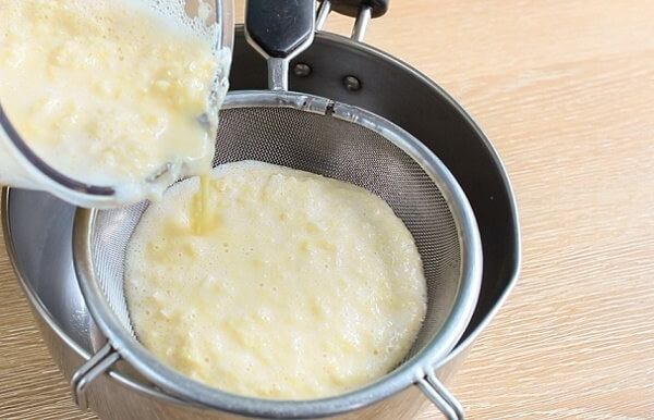 Bước 5: Cho hạt đã bóc tách vào máy xay sinh tố với 1,5 lít nước luộc bắp hoặc nước lọc xay thật nhuyễn. Sau đó đem hỗn hợp lọc qua rây để lấy nước và bỏ bã.