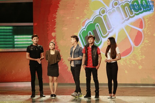 | Hai đội chơi “Da nâu” của Hồ Quang Hiếu - Trương Quý Nhi (phải) và “Hai chị em” của Mai Phương - Anh Tài cùng MC Ngô Kiến Huy. |