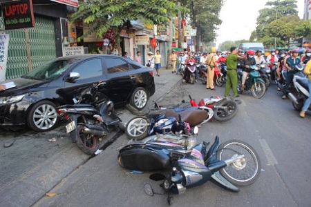 Khoảng 7h ngày 23/1, tài xế điều khiển xe ô tô 4 chỗ hiệu Kia mang BKS: 56S – 2639, lưu thông trên đường Phan Văn Trị hướng từ đường Thống Nhất về đường Phạm Văn Đồng (TP.HCM). Gần tới đường Nguyễn Oanh thuộc Q.Gò Vấp thì chiếc xe bất ngờ lao nhanh qua phía tay phải tông thẳng dòng người đang chạy xe gắn máy.