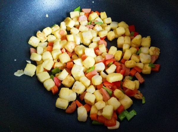 - Bước 4: Thêm rau củ và xúc xích thái hạt lựu vào đảo chung cùng chút muối.