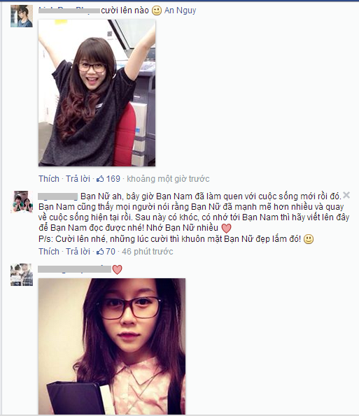 "Bạn Nữ à, bây giờ Bạn Nam đã làm quen với cuộc sống mới rồi đó. Bạn Nam cũng thấy mọi người nói rằng Bạn Nữ đã mạnh mẽ hơn nhiều và quay về cuộc sống hiện tại rồi. Sau này có khóc, có nhớ tới Bạn Nam thì hãy viết lên đây để Bạn Nam đọc được nhé! Nhớ Bạn Nữ nhiều. P/s: Cười lên nhé, những lúc cười thì khuôn mặt Bạn Nữ đẹp lắm đó", một fans chia sẻ.